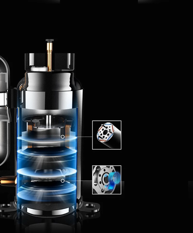 Unique compressor technologySwing compressor, low vibration, low noise, no refrigerant leakage, longer use.Reluctance type DC motor, 6-level reluctance design, smoother rotation, effectively improving operation efficiency. The compressor runs more stable.The integrated design of the rotor and the blade, the machining accuracy of 3 microns and the integrated design of the rotor and the blade, avoid friction and refrigerant leakage, and are more durable.Unique compressor technologySwing compressor, low vibration, low noise, no refrigerant leakage, longer use.Reluctance type DC motor, 6-level reluctance design, smoother rotation, effectively improving operation efficiency. The compressor runs more stable.The integrated design of the rotor and the blade, the machining accuracy of 3 microns and the integrated design of the rotor and the blade, avoid friction and refrigerant leakage, and are more durable.