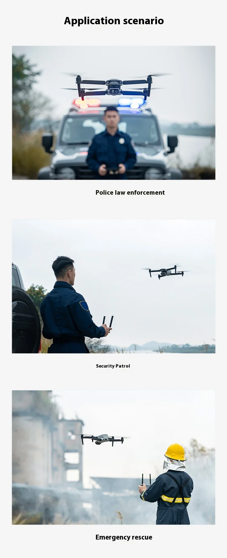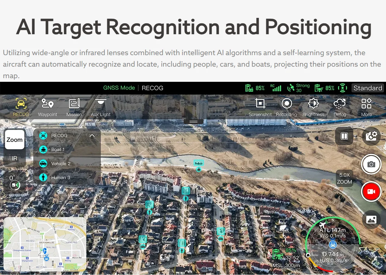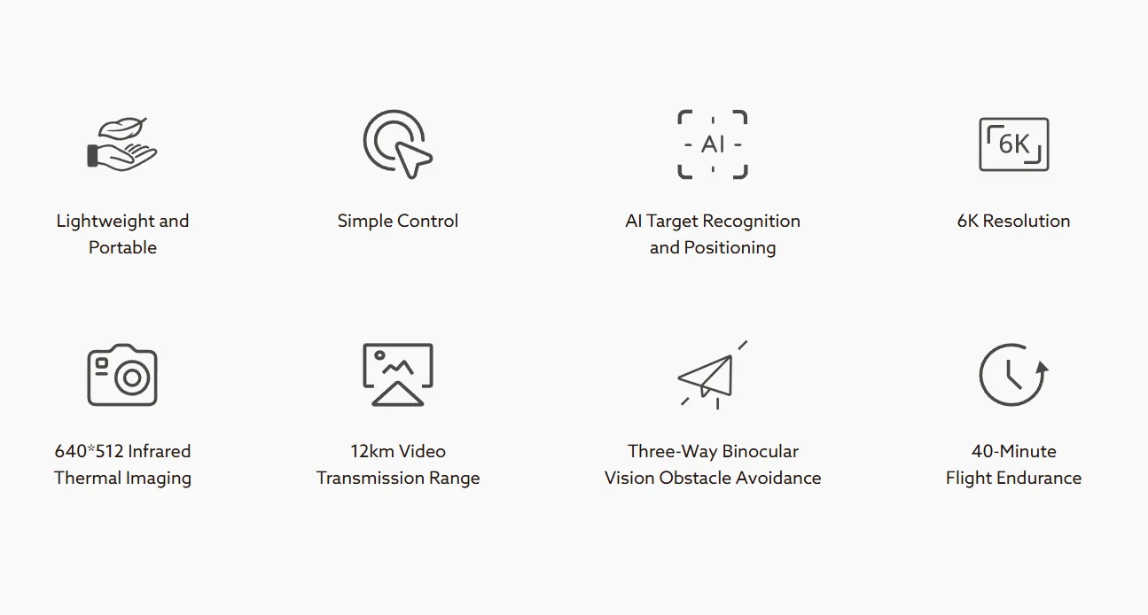 operation. It features a dual-camera gimbal with a visible-light camera for high-definition imaging and a thermal camera to support decision-making in critical tasks. Equipped with AI target recognition, it enables automatic identification and geolocation of multiple objects. The tri-directional binocular vision obstacle avoidance system ensures safe flight operations. With integrated seamlessly software APP, it offers intuitive controls and enabling single operator deployment. Ideal for applications such as public safety, emergency rescue, industrial inspections, and more, these drones deliver efficiency and precision in demanding scenarios.