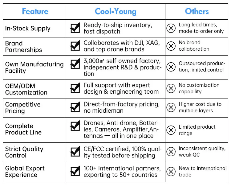 Shenzhen Cool-Young Technology is a leading UAV technology enterprise dedicated to the R&D, manufacturing, and customization of High-Performance Drones, Drone Accessories, Antennas, and Anti-Drone. With a strong presence on Alibaba International, we proudly serve global clients with innovative, reliable, and scalable UAV solutions. With over a decade of engineering excellence, Cool-Young has earned a reputation as a strategic partner to some of China’s most renowned drone companies — including DJI, XAG (XAG Tech), and other national UAV brands. Our products are widely adopted in sectors such as agriculture, security, power inspection, logistics, and public safety. What Makes Us Different?