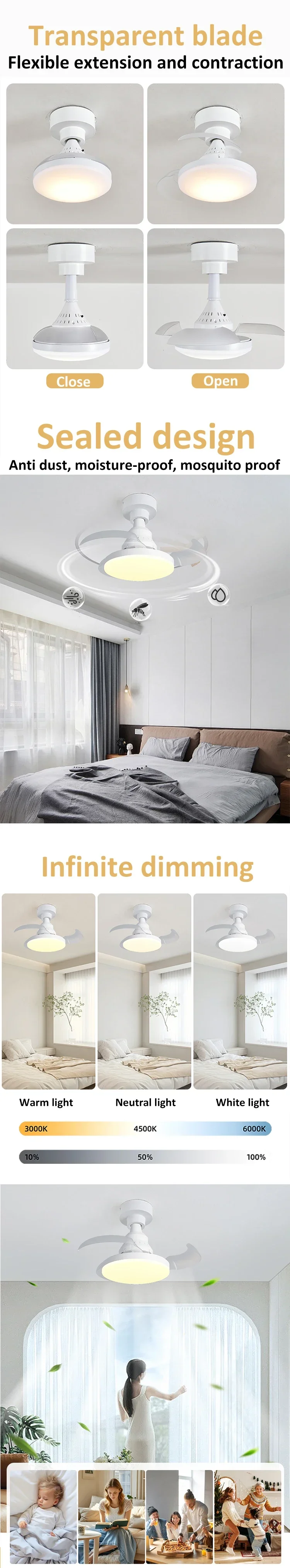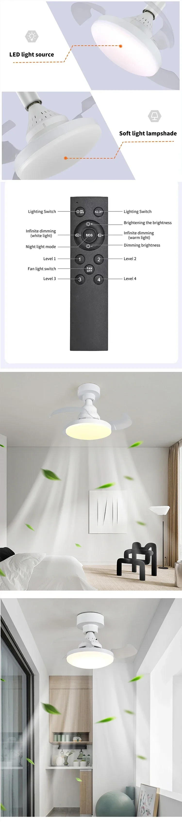 Product Functions:Dimmable;4-speed wind control;Remote control;No-wiring installation;Timer;Light memory function
