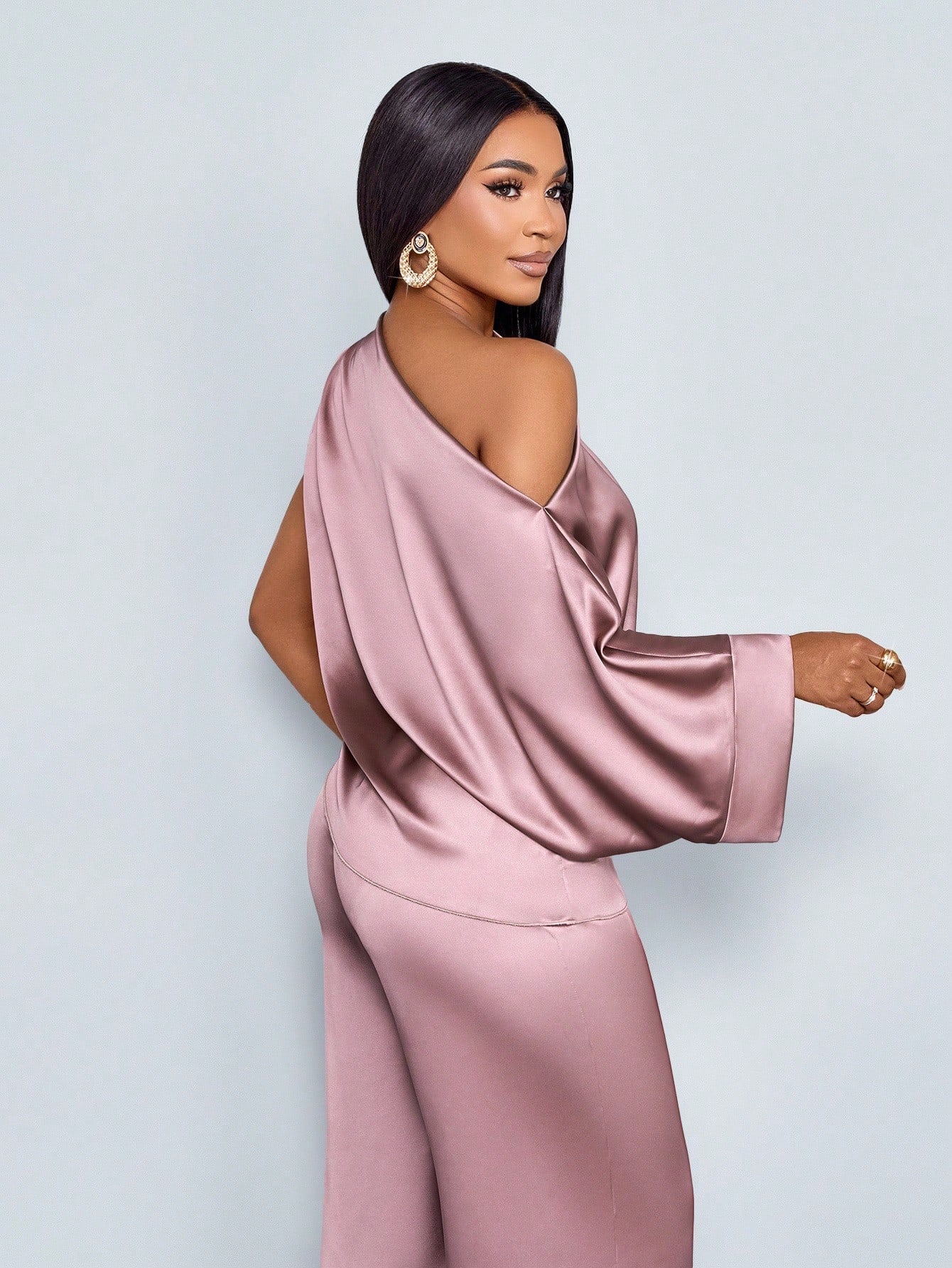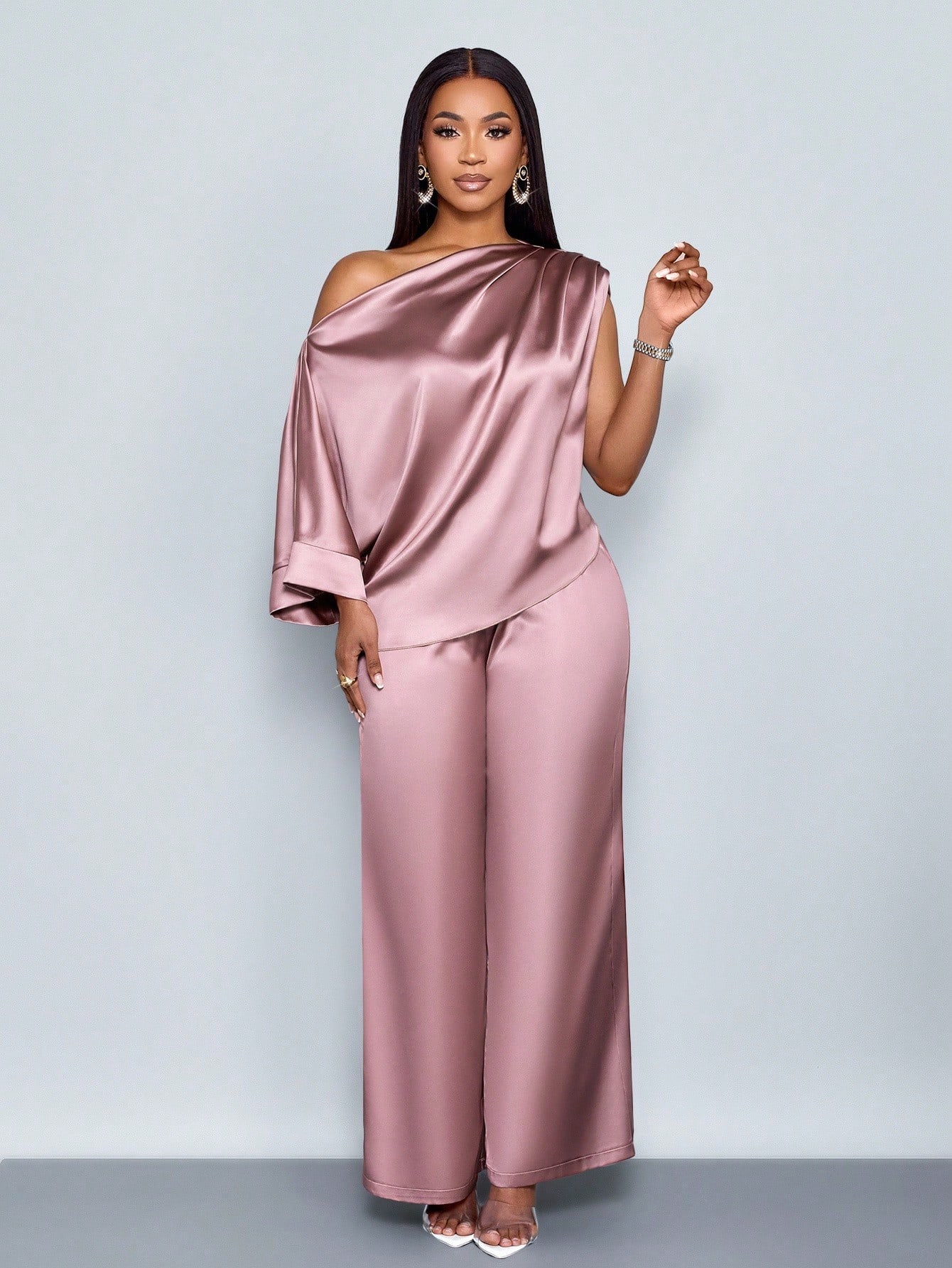 SOLERSUN Fashionable Solid Color Elegant Ruched Asymmetrical Neck Stylish And Sophisticated Batwing Sleeve Asymmetrical Hem Satin Blouse & Straight-Leg Elegant Long Pants Sets